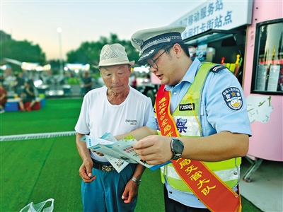 近日,通辽市公安局开发区分局交管大队走进开发区孝庄河夜市组织开展“法治服务直通车”宣传活动。民警走街串巷为摊主、群众一对一解答疑惑,面对面讲解交通安全法律法规,同时发放交通违法典型案例宣传页。