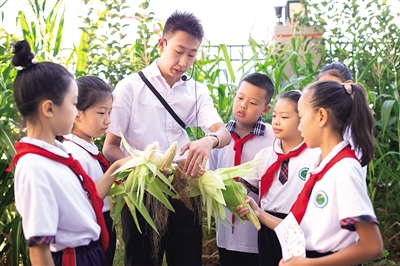 8月30日,在呼和浩特市南门外小学昭乌达南路分校农作物种植区,教师为学生讲授关于玉米作物的种植知识。当日,该校开展“相遇美好掌上荷花”主题劳动课。课上,相继进行了收获与采摘、手工再制作等活动,通过依托校园种植区,把农耕文化融入师生教学生活中。