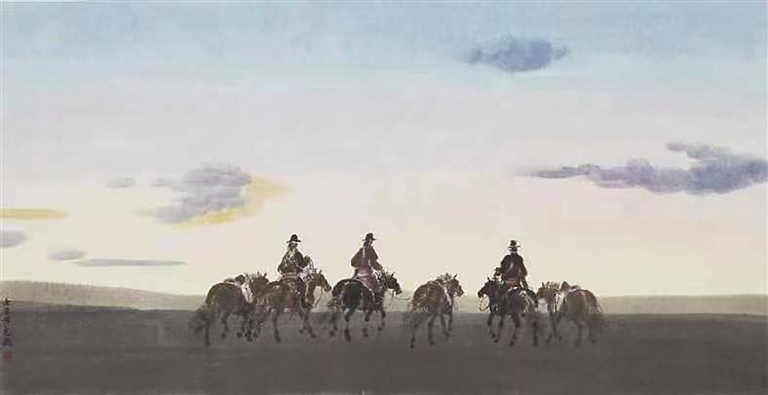 周荣生曾是内蒙古美术家协会主席,展览中,他的一副国画《驰》,因揭示了人与骏马之间的默契而令人难忘。迄今,以马喻人、以人化马的作品不在少数,但“人马合一”到出神入化境地的作品,却是需要长久的、雄厚的生活基础和深切的体验与情感的。你看,画面上那匹扬鬃奋蹄的骏马,每一块肌肉和每一根骨头都刚劲有力,马背上的蒙古族汉子,高颧骨、细长眼、高鼻梁,完全沉浸在烈马追风的惬意中,让观众感受到一种酣畅淋漓、恣肆无束的畅然和快意。孙志钧的《夏日牧场》,虽然借助了些许西方点彩的技巧与中国画水墨融合的技法,让观众看到的只是骑手的背影,但若没有北疆草原生活的积淀,是不会在构图中细腻地描绘出三个牧人与六匹骏马的——因为,远行的牧人若没有备用的马匹,即使目标明确,马力不逮,也枉然。
