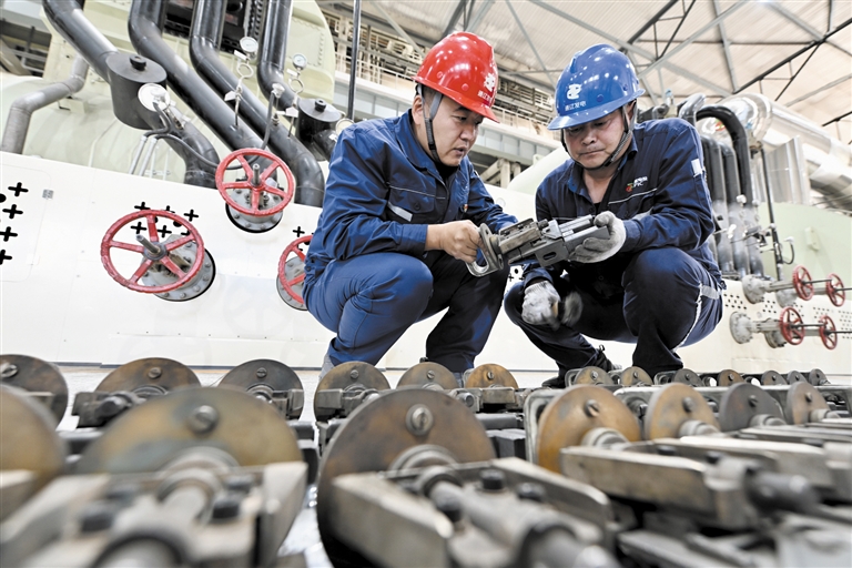 近日,通辽霍林河坑口发电有限责任公司工作人员正在查看供热设备运行情况。霍林河坑口发电有限责任公司位于霍林郭勒市,霍林郭勒市每年10月1日进入供热期,为保证供热季能够准时供热,该公司通过加强供热参数调整、积极储煤、加大巡检力度等措施,消除隐患,保证设备正常运行。本报记者 孟和朝鲁 摄