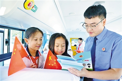 为激发青少年学习法律知识的兴趣,鄂尔多斯市伊金霍洛旗人民检察院与旗教育体育局、某校车运输公司联合开展了“检教普法”活动,将未成年人法治教育和校车服务有机结合,共同打造“伊心护苗”普法校车。图为检察人员近日在普法校车上为孩子们讲解法律知识。