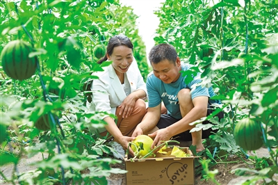 兴安盟扎赉特旗探索“党建+企业+农户”利益联结机制,积极发展庭院经济,由党员示范户带动农户利用庭院闲置土地种植圣童小西瓜,企业负责提供技术指导和服务,并统一签订回收订单,实现户均增收2万元以上。图为宝力根花苏木党员示范户在采摘西瓜。苏晓东 摄