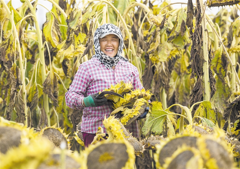10月2日,巴彦淖尔市五原县新公中镇光联村农民在田间抢收葵花。巴彦淖尔市作为全国向日葵主产地,种植面积400多万亩,占全国总面积四分之一,产量占全国三分之一,优质葵花籽出口90多个国家,为当地农民增收致富提供了保障。本报记者 郭馨阳 摄