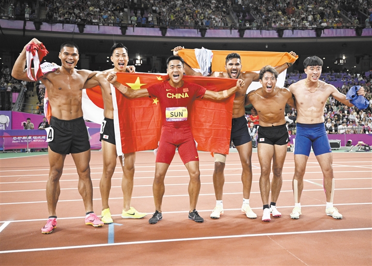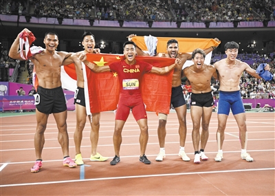10月3日,选手们在比赛结束后合影。当日,杭州亚运会田径项目男子十项全能比赛在杭州奥体中心体育场进行第二日的比赛。中国选手孙启豪夺得该项目冠军,印度选手泰贾斯温·尚卡尔获得亚军,日本选手丸山优真获得季军。 新华社记者 宋彦桦 摄