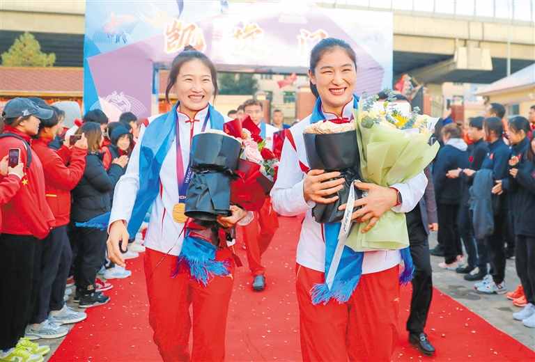 10月8日,亚运冠军李倩(右)、杨柳结束亚运会征程返回呼和浩特。当日,杭州第19届亚运会闭幕,我区运动员李倩、杨柳、布和毕力格、青达嘎、佈和额尔敦返回呼和浩特,受到了队友和粉丝的热烈欢迎。本届杭州亚运会,我区共派出13名运动员参加了7个大项的比赛,最终获得了2金2银2铜的好成绩。 本报记者 王彬 摄
