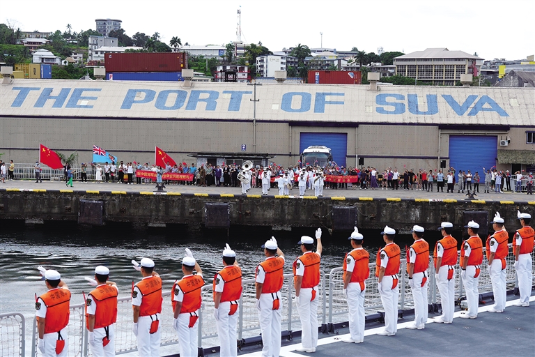 10月8日,人们在斐济苏瓦港国王码头为中国人民解放军海军戚继光舰官兵送行。搭载300余名海军院校学员的中国人民解放军海军戚继光舰10月8日结束对斐济友好访问,离开斐济首都苏瓦,继续开展远海实习。
