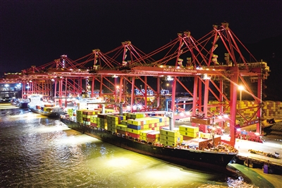 在浙江省宁波舟山港穿山港区集装箱码头,“地中海琳妮三号”(MSC RINI Ⅲ)轮进行集装箱吊装作业(无人机照片,9月21日摄)。近年来,浙江省宁波舟山港发挥区位优势,加强与共建“一带一路”沿线伙伴的贸易合作,拓展海陆运输通道,推进高质量共建“一带一路”行稳致远。 新华社发