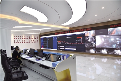 轻点采煤按钮,设备自动运行……在宏丰公司红树梁煤矿智控指挥中心,巨大的电子屏实时显示着采煤场景,井下的安全生产状况和设备的运行状态一览无余。