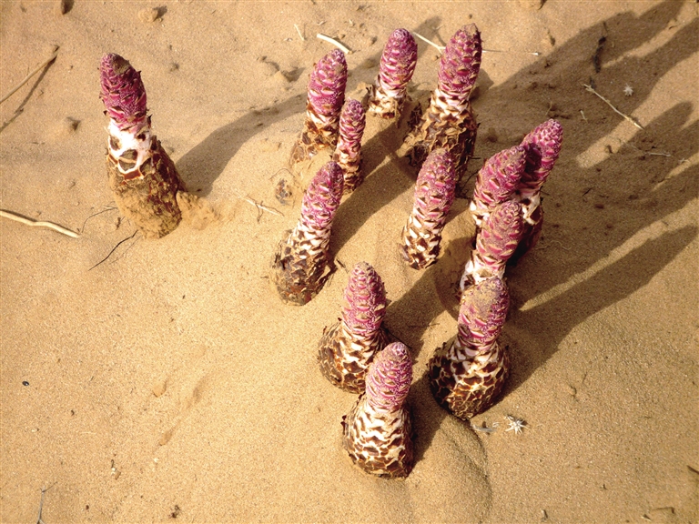 自2000年阿拉善盟百万亩梭梭生态林基地建设项目启动以来,目前已建成9个规模化的梭梭肉苁蓉产业基地,造林总面积814万亩,人工接种肉苁蓉146.7万亩。阿拉善左旗林工站站长刘宏义告诉笔者,百万亩梭梭生态林基地的建设,不仅取得了防沙治沙的显著成效,而且调动了农牧民种植梭梭的积极性,还培育了梭梭肉苁蓉产业,促进了农牧民增收,走出了一条生态产业化、产业生态化的绿色惠民路子,实现了治沙与致富的有机统一。