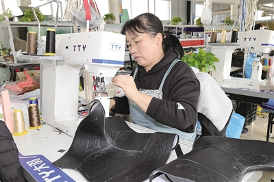 近日,位于乌兰察布市凉城县鸿茅镇移民小区桃源山庄的内蒙古蒙靴固邦鞋服脱贫车间里,缝纫机、压花机等多台机器快速运转,整齐排列的3行工作台上,下料、裁剪、制鞋面、粘胶、定型、上底……十几道工序,工人们分工协作,环环相扣,在各自的岗位上忙碌着。