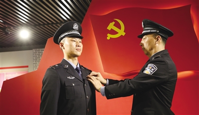 为进一步激发广大民警党员的责任感、荣誉感和使命感,近日,呼和浩特铁路公安处二连车站派出所组织全体党员民警来到二连站党员教育基地,开展“重温入党誓词,坚定理想信念”主题党日活动。图为派出所老党员为新党员佩戴党徽,勉励新党员铸牢忠诚警魂,争做合格党员。 本报记者 陈春艳 摄