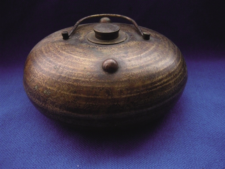 山东省枣庄市鲁南民俗博物馆收藏着一件清朝时期的紫铜汤婆子,形状似南瓜,外表刻有纹饰,有提手,保存完好。