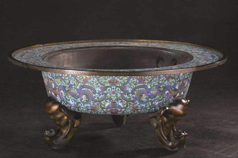 文中是清代中期的掐丝珐琅夔凤三足大火盆,现收藏于沈阳故宫博物院。火盆铜胎,圆形口,口沿为宽板沿外折,下部为鼓腹,底部有象首形三足。全器以掐丝珐琅制成,均为浅蓝色珐琅釉地,板沿及腹身皆饰蓝色夔凤纹及繁密的绿、蓝、粉、黄色缠枝花纹,个别纹饰有填白,增加了图案的美感。盆口沿边缘錾刻一圈回纹,因常年使用鎏金已失。腹下部有鎏金三象首形足,象耳下垂,双牙直伸,象鼻子触地向上卷曲。盆内另附盛炭之器,为脸盆形状,内沿设置2个活环,以方便取用。这件珐琅火盆为宫廷里冬季取暖用具,集实用与欣赏于一体。