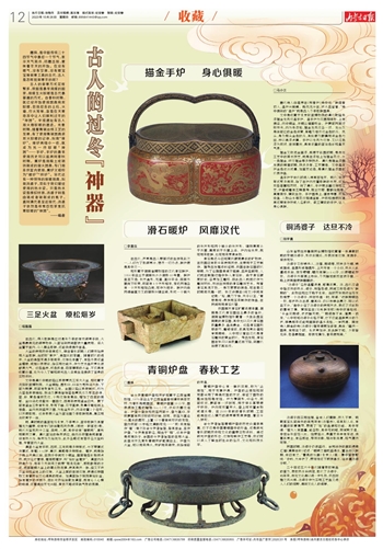 唐代诗人白居易在《别春炉》诗中说:“暖阁春初入,温炉兴稍阑。晚风犹冷在,夜火且留看。”诗中提到的“温炉”就是古人冬季取暖器具。