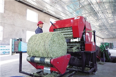 走进套海村柠条加工厂的生产车间,一捆捆柠条枝被飞旋着的刀盘疯狂“咀嚼”,经过一系列加工工序,最终揉捻成一个个“青贮饲料包”。