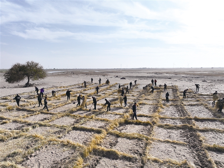 放眼望去,连绵起伏的沙丘上,3米见方的草方格沙障纵横交错,犹如排列整齐的“魔方”覆盖在沙丘上,构筑起一道道绿色屏障。