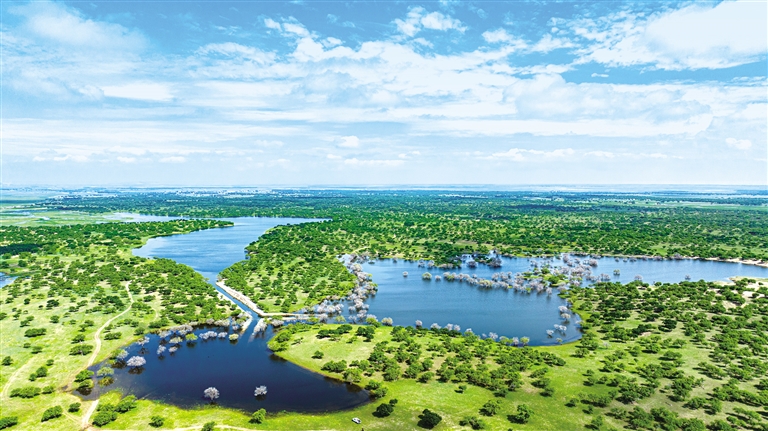 穿行在兴安盟科右中旗,一片片樟子松、沙棘、柠条郁郁葱葱,牢牢锁住脚下黄沙;一群群牛羊进了棚圈,富民产业既治沙又致富;一群群飞鸟、野鸭在这里游弋、嬉戏,尽情展示生态之美和勃勃生机。