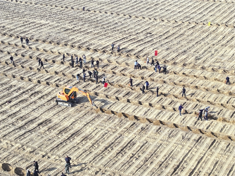 在额木庭高勒苏木查干宝浩嘎查,一排排新栽种的文冠果树苗错落有致,正在为大地披绿衣。