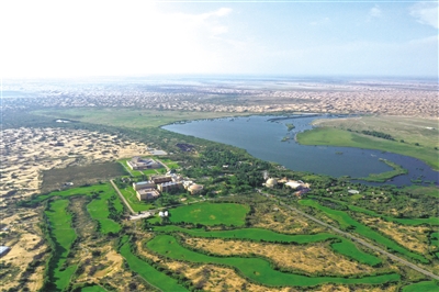 沿着穿沙公路,高空航拍库布其沙海,传说中的黄鳞滚滚无边无垠的沙海隐入了绿光娉婷的浩瀚生机之中,一望无际的绿林和植被覆盖着沙漠,郁郁葱葱的林海在阳光下无限伸展,沙柳、梭梭、肉苁蓉、沙竹、沙枣、胡杨、旱柳、甘草、红柳等沙漠植物地毯似的铺展在沙丘之上。盐海子移民新村,就在这一条穿沙公路的腹地,像一朵白莲花一般安卧于公路之畔,尽享阳光、温暖、明艳的恩泽。搬迁在此安居的牧民们,心里的幸福感像一泓清泉流淌……