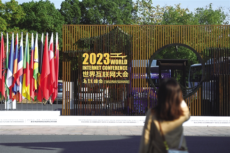 11月7日拍摄的世界互联网大会乌镇峰会迎宾入口。以“建设包容、普惠、有韧性的数字世界——携手构建网络空间命运共同体”为主题的2023年世界互联网大会乌镇峰会将于11月8日至10日在浙江乌镇举行。 新华社记者 黄宗治 摄