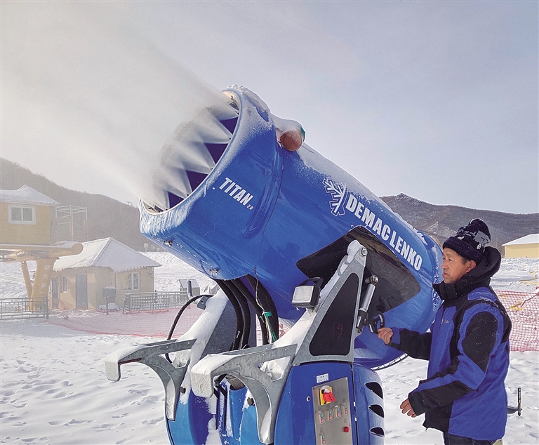 11月8日,在扎兰屯金龙山滑雪场初级赛道上,7台造雪机满功率运转。目前造雪量平均每小时达20立方,预计7天左右完成初级雪道造雪任务。在“十四冬”倒计时100天之际,扎兰屯赛区各项工程已进入收尾阶段。