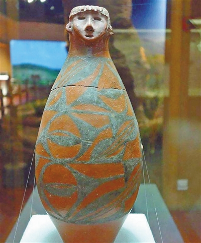 点评:人形器口彩陶瓶用细泥红陶塑造了一位端庄典雅的美少女形象。以雕塑与彩饰浑然一体,极其自然,充分体现出5000年前人类的聪明才智。