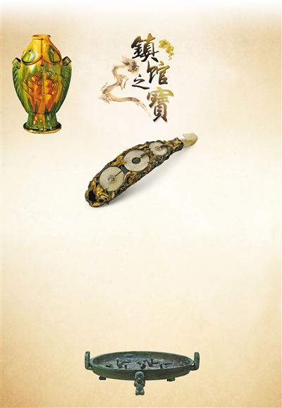 点评:包金镶玉兽首银带钩虽然尺寸比普通带钩长,但在制作时以修长的鸟身作“S”形盘曲回旋,转角处理上运用圆角过渡的手法,弱化了凝重感。整器以鎏金、镶嵌、凿刻等多种工艺,将不同材质、不同色泽的材料巧妙结合,制作华美,纹饰繁复,是目前所发现战国时期金银工艺器物中的上乘之作。2013年,该带钩被列入《第三批禁止出国(境)展览文物目录》。