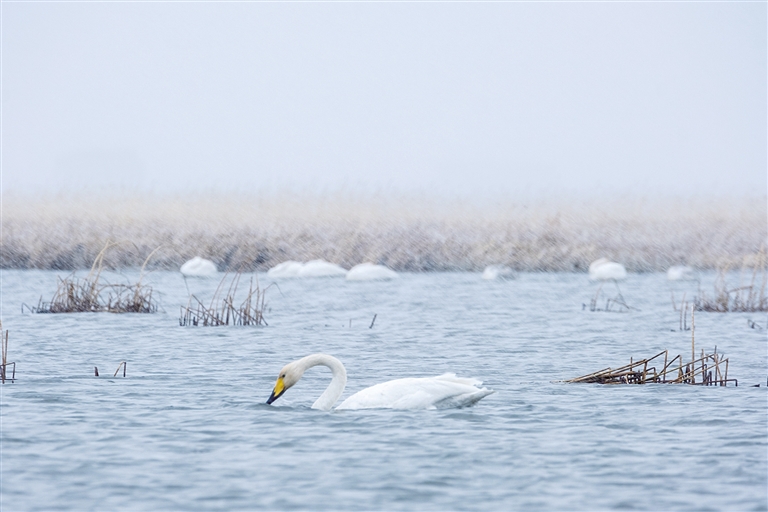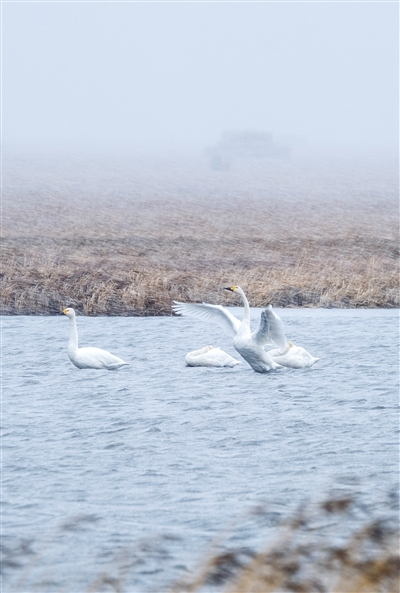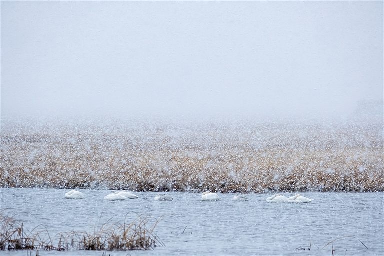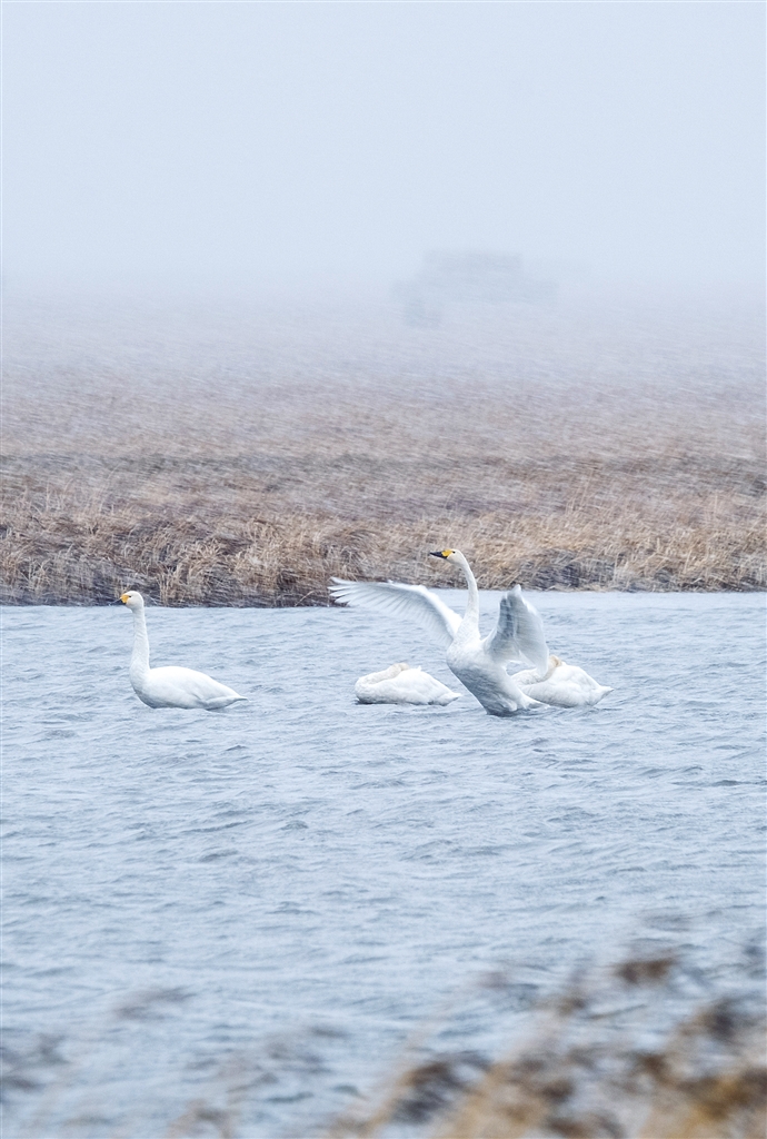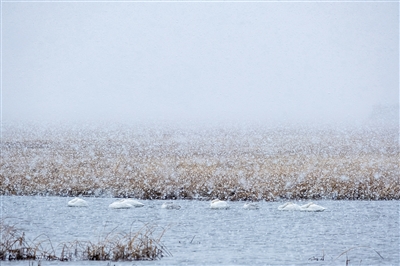 初冬,霍林郭勒市额仑湖飘起雪花。百余只在此暂住的天鹅或悠然觅食,或奋翅鼓翼,笑傲风雪,准备南迁。