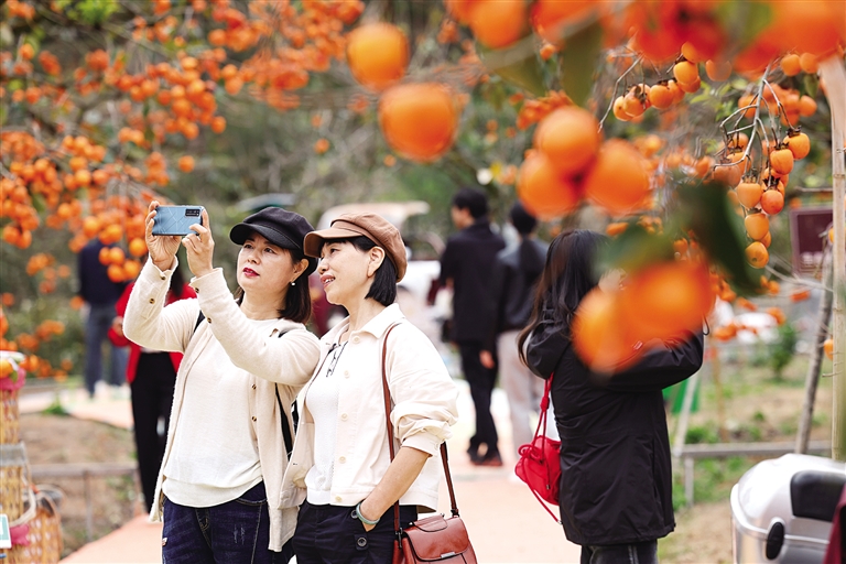 11月12日,游客在宁德市古田县利洋村柿子园游玩。初冬时节,福建省宁德市古田县利洋村柿子园的枝头挂满了橘红的柿子,给这个小山村增添了亮丽的色彩,吸引游客前来游玩。 新华社发