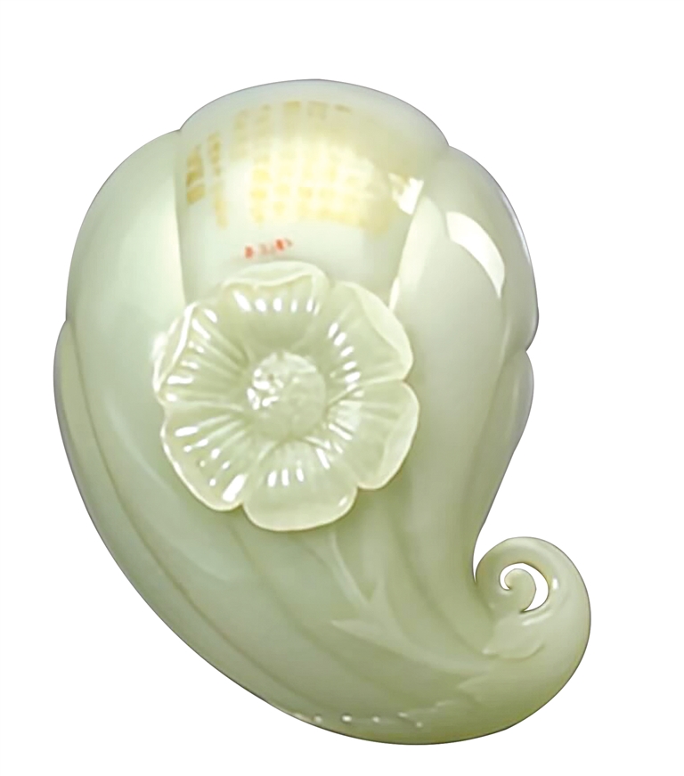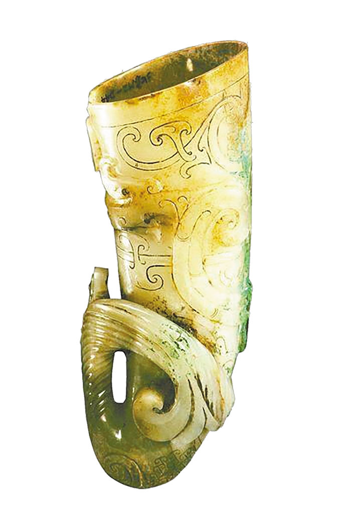文中是西汉时期的角形玉杯,半透明,局部有红褐色浸斑。杯口呈椭圆状,口沿阴刻弦纹一周。杯体由上至下逐渐收拢,在杯尾卷曲处形成翻卷的浪花形。杯底有绳索式尾,缠绕在杯体下部。外壁以浅浮雕和双钩法饰勾连云纹,云纹内饰一只威风凛凛的独角夔龙振翼飞舞,修长俊美,环绕杯身。历经2000年风雨沧桑,角形玉杯依然温润。