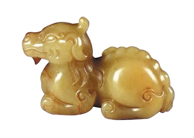 君子如玉,温润清雅。杭州博物馆收藏的宋代黄玉独角卧兽,成为宋代玉文化多元发展的鉴证。黄玉独角卧兽,是典型的宋代瑞兽摆件,玉质通透,色泽清黄。瑞兽呈匍匐状,正视前方,颈部略向后倾斜,独角向后高高扬起;鼻翼两侧装饰勾云纹,下巴细刻一撮胡须,双耳弯曲下垂贴于脑后;脑后及耳下部刻划3缕长鬃,垂于两侧;背部以连珠纹推磨出浑圆的珠状脊骨;兽尾分为3缕贴于臀部左右,四肢弯曲,四爪雕有长而尖锐的三趾。展现了宋代玉器细致、写实的艺术风格。