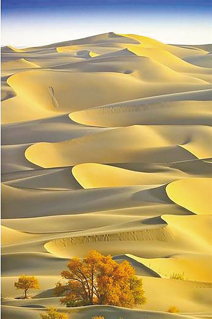 如果,你有过乘船海上的经历,就会自然而然地理解沙漠的容颜和品格,以及对于妩媚与雄浑的另一种诠释。即便一个是蔚蓝无边、波涛涌动、碧空万里,一个是金辉泼洒、绵厚深邃、大漠孤烟。