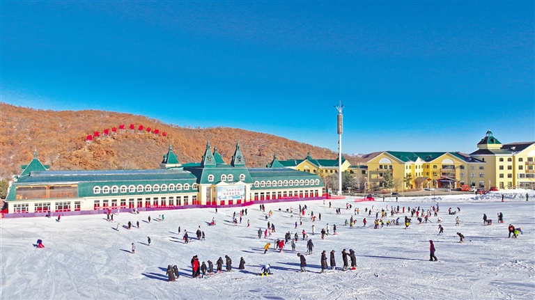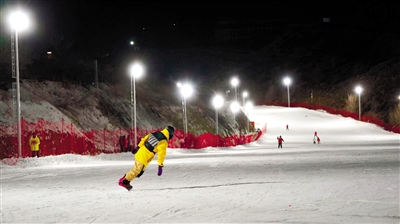 在赤峰市道谷南山滑雪场,雪地摩托、雪圈冲浪、冰上自行车、迷你冰壶、冰上爬犁等丰富多彩的冰雪娱乐项目吸引着游客参与到冰雪运动中来。