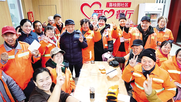 12月18日,包头市石拐区的环卫工人们正在享用免费爱心早餐。为了让环卫工人在工作时抵御寒冷,包头市石拐区居家养老服务中心从12月15日至12月31日,依托爱心餐厅为环卫工人免费提供早餐,同时购置了暖宝贴、生姜茶等取暖用品,供环卫工人免费取用。一份份热乎乎的汤饭,温暖着寒冬里的环卫工人。本报记者 孟和朝鲁 摄