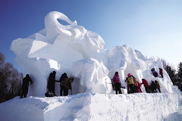 12月19日,雪雕师在创作雪雕作品《万象更新》。目前,第36届哈尔滨太阳岛国际雪雕艺术博览会在紧张建设中,雪雕师加紧进行雕刻作业。本届太阳岛“雪博会”总用雪量15万立方米,主塑用雪量达3.5万立方米。