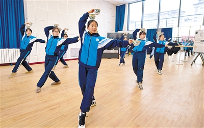 12月25日,学生们在舞蹈教室练习顶碗舞。为深入落实“双减”政策,鄂尔多斯市伊金霍洛旗蒙古族中学以学生为中心,建立了一套适合学生发展的课程体系,包含学科教学、兴趣课程、特长培养以及德育教育等,以多彩课程促“双减”,成就“幸福教育”。 本报记者 王磊 李卓 摄