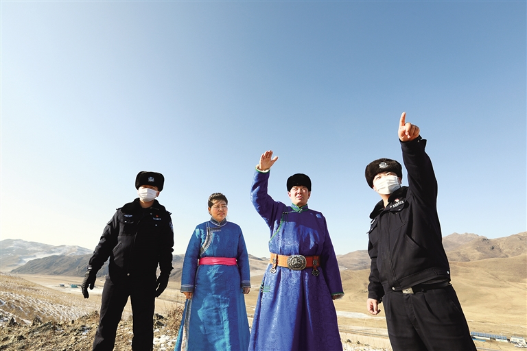 近日,兴安盟科右前旗乌兰毛都边境派出所民警来到“边境堡垒户”门德和敖特根其木格牧点开展“北疆同心圆 民族团结一家亲”主题党日活动,向牧民群众讲解党的民族理论政策和边境安全知识,引导他们牢固树立休戚与共、荣辱与共、生死与共、命运与共的共同体理念。图为边防民警与牧民共同巡边。本报记者 许敬 通讯员 包青松 摄