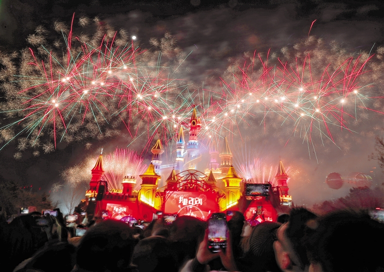 2024年1月1日,游客在沈阳方特欢乐世界观看烟花表演。辞旧迎新之际,全国各地举办各种跨年活动迎接2024年的到来。