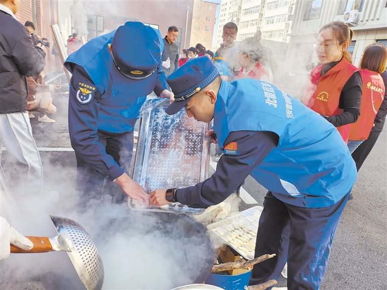 “饺子下锅喽!”伴随着洪亮的吆喝声,3万多个饺子下锅,蒸腾的热气温暖了在场每一个人的心窝。