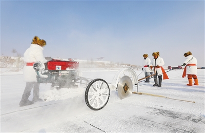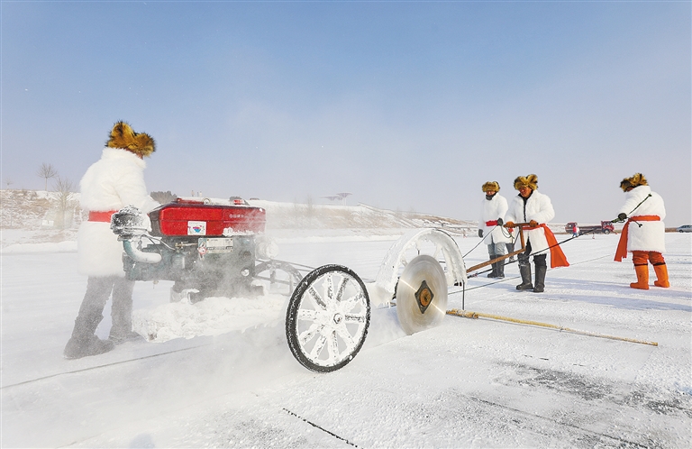 新年前夕,工人在呼和浩特大黑河军事文化乐园北侧冰封的大黑河上采冰。据了解,以“丝路之光 雪舞青城”为主题的第三届呼和浩特欢乐冰雪节将于2024年1月12日开幕,冰雪节开放总面积达27万平方米,冰建用冰量预计超1万立方米。本报记者 王磊 摄