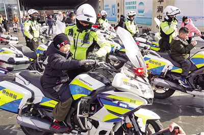 1月7日,小朋友在山东烟台万象汇广场体验警用摩托车。近日,各地公安机关举行警营开放日、警民互动等活动,向人们展示警用装备,普及警务知识和法律法规常识,迎接即将到来的第四个中国人民警察节。新华社发