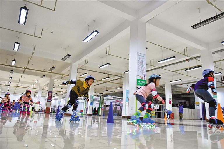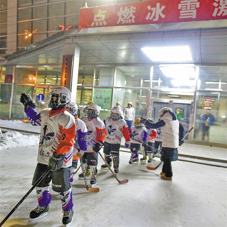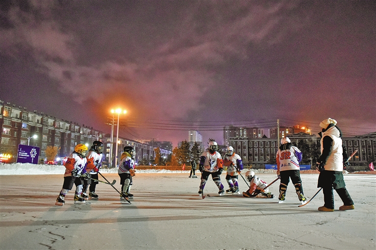 严冬时节,夜色渐暗,训练馆里的灯光依旧格外耀眼,滑冰场上的训练正如火如荼地进行着。一个个小小的身影在冰上飞驰旋转,教练员们手把手对速度滑冰、冰球等项目的基础动作及体能训练进行指导。