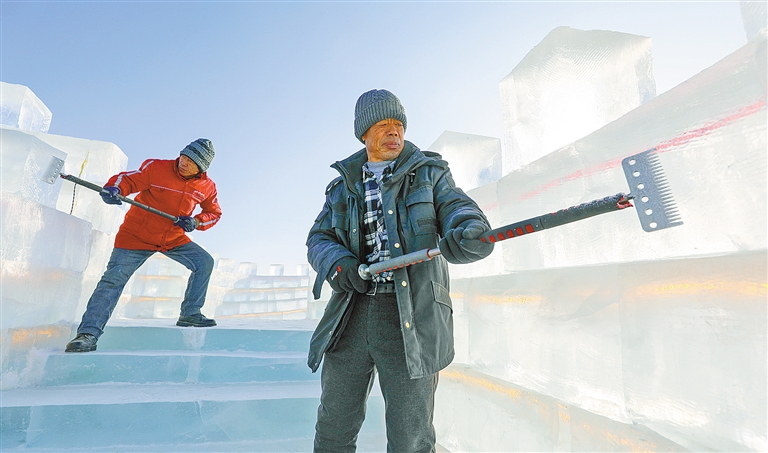 1月3日,在第三届呼和浩特欢乐冰雪节园区,冰雕师正在打磨冰块,加紧制作冰雕。该园区将于1月12日开园,为广大群众打造一个集冰雪艺术、冰雪文化、冰雪演艺、冰雪建筑、冰雪活动、冰雪体育于一体的冰雪乐园。本报记者 王磊 摄