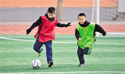 1月8日,呼和浩特市玉泉区南茶坊小学的小球员们正在进行头球训练。当日,该小学校园足球冬训营开营,足球小将们将在未来6周的时间里系统接受足球理论教学和操作训练,在绿茵场上乐享寒假生活。本报记者 王磊 摄