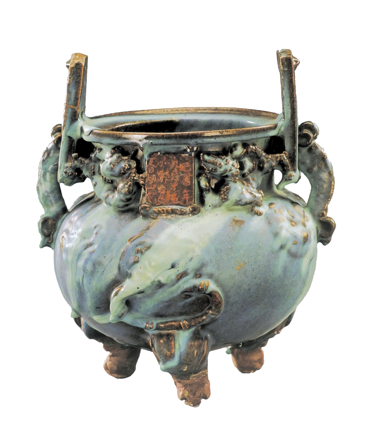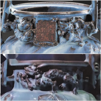 这6件瓷器,不论是钧瓷还是龙泉瓷,共同的特征是器型大,胎骨厚重,这种雄浑的作风是元代瓷器的基本特征。香炉上的龙、凤、麒麟等花纹装饰,也是元代常见的题材。3件龙泉窑瓷瓶,底部都承托着瘦长的莲瓣纹装饰,也是元代的风格。由此,考古专家们判定,这批窖藏是元代瓷器。