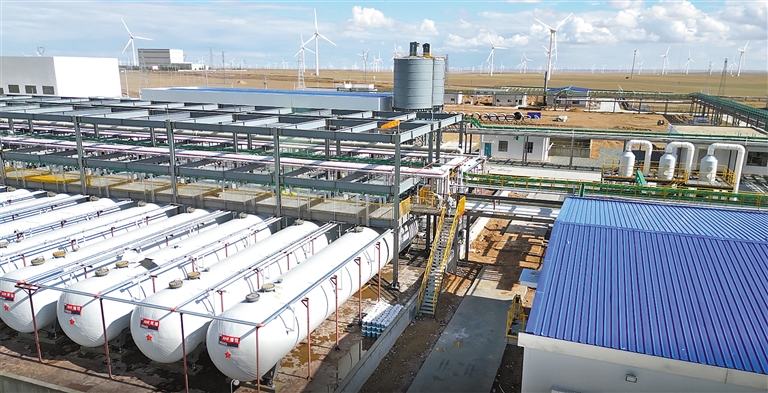 在华电达茂旗20万千瓦新能源制氢工程示范项目竣工现场,记者看到6个大球罐,它们采用碱性电解槽电解技术,结合风光新能源发电特性,利用网电和储能作为制氢的互补电源提高制氢设备利用小时数。经过核算初定制氢规模1.2万Nm3/h,年制氢量7800吨,氢气纯度99.999%,储氢设施设计储氢能力约为14.4万Nm3,可满足现阶段所有制氢设备满负荷运行12小时的氢气储量。这是自治区首批、包头市首家风光储氢一体化大规模应用项目。