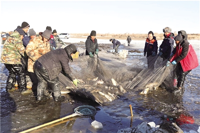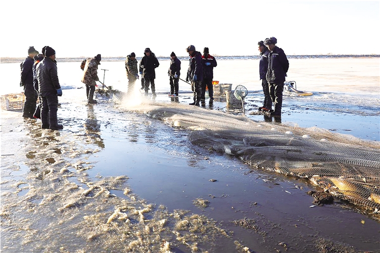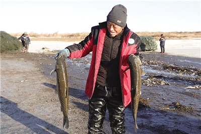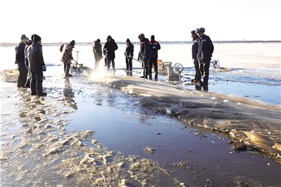日上三竿,在“鱼把头”的号子声中,众人齐心协力将渔网拉出水面,凿好的冰面升腾起白色的水汽,一条条鲜活的大鱼扑腾着跃上水面,场面十分壮观。