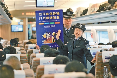 为确保旅客乘车安全,包头铁路公安处乘警支队民警强化日常巡视。图为民警们开展反诈宣传。