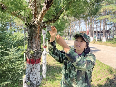西伯利亚红松第一次开花是王翠丽最激动也是最害怕的一次经历。当时,瘦弱的她顶着大风,爬上了6米多高的梯子给大树授粉,下来后她尽管双腿发软,还嘴硬道:“不恐高了!”王翠丽“女汉子”的外号越传越远。