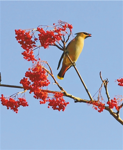 在冬天,尤其是冰天雪地的深冬,太平鸟在深山觅食艰难了,就纷纷飞进锦山小镇,成为锦山一道美丽的风景。它们是奔着花楸等树木的果实来的。据说,有一种鸟,总是青睐树上经霜的红柿子,入冬,就去柿树枝头啄食残存的果实。太平鸟亦然,它们与花楸如影随形。